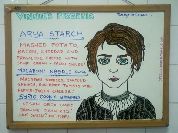 gotvinniesarya Published April 24, 2013 at 600 × 448 in DINNER IS COMING: Brooklyn Pizzeria’s Menu Riffs Off ‘Game of Thrones’ [Picture Gallery] --- NEXT › --- NEXT › Sharing is Caring: Click to share on Facebook (Opens in new window) Facebook Click to share on X (Opens in new window) X Click to email a link to a friend (Opens in new window) Email More Click to share on Pinterest (Opens in new window) Pinterest Click to share on Mastodon (Opens in new window) Mastodon