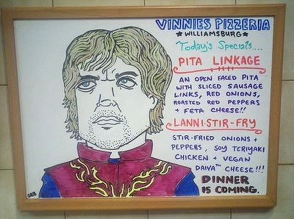 gotvinniestyrion Published April 24, 2013 at 600 × 447 in DINNER IS COMING: Brooklyn Pizzeria’s Menu Riffs Off ‘Game of Thrones’ [Picture Gallery] ‹ PREVIOUS --- NEXT › ‹ PREVIOUS --- NEXT › Sharing is Caring: Click to share on Facebook (Opens in new window) Facebook Click to share on X (Opens in new window) X Click to email a link to a friend (Opens in new window) Email More Click to share on Pinterest (Opens in new window) Pinterest Click to share on Mastodon (Opens in new window) Mastodon
