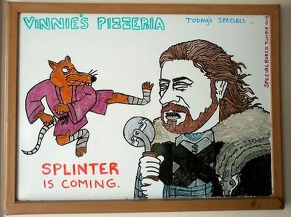 splinter-is-coming Published April 24, 2013 at 600 × 447 in DINNER IS COMING: Brooklyn Pizzeria’s Menu Riffs Off ‘Game of Thrones’ [Picture Gallery] ‹ PREVIOUS --- NEXT › ‹ PREVIOUS --- NEXT › Sharing is Caring: Click to share on Facebook (Opens in new window) Facebook Click to share on X (Opens in new window) X Click to email a link to a friend (Opens in new window) Email More Click to share on Pinterest (Opens in new window) Pinterest Click to share on Mastodon (Opens in new window) Mastodon