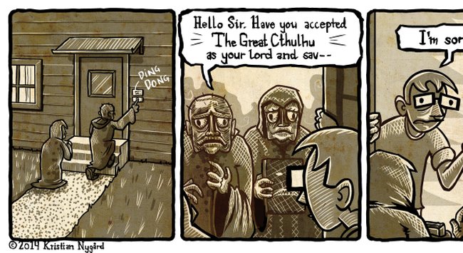 witnesst Published April 13, 2015 at 650 × 355 in Cthulhu’s Witnesses [Comic] ‹ PREVIOUS --- ‹ PREVIOUS --- Sharing is Caring: Click to share on Facebook (Opens in new window) Facebook Click to share on X (Opens in new window) X Click to email a link to a friend (Opens in new window) Email More Click to share on Pinterest (Opens in new window) Pinterest Click to share on Mastodon (Opens in new window) Mastodon