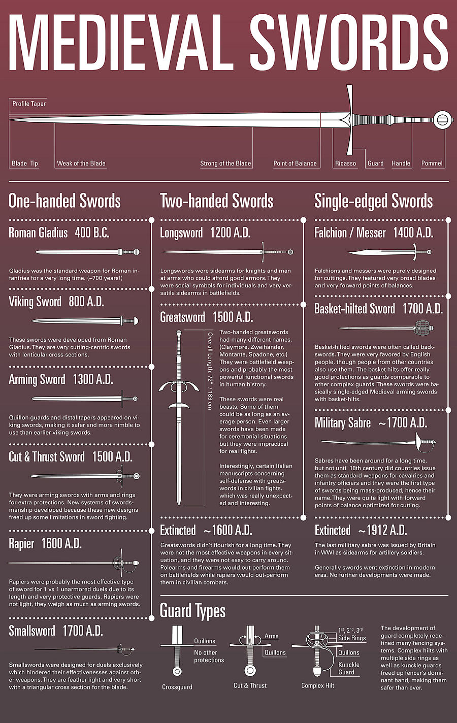 A Brief Guide to Medieval Swords Published July 15, 2018 at 900 × 1424 in A Brief Guide to Medieval Swords [Infographic] --- NEXT › Click Picture to Enlarge! --- NEXT › Sharing is Caring: Click to share on Facebook (Opens in new window) Facebook Click to share on X (Opens in new window) X Click to email a link to a friend (Opens in new window) Email More Click to share on Pinterest (Opens in new window) Pinterest Click to share on Mastodon (Opens in new window) Mastodon